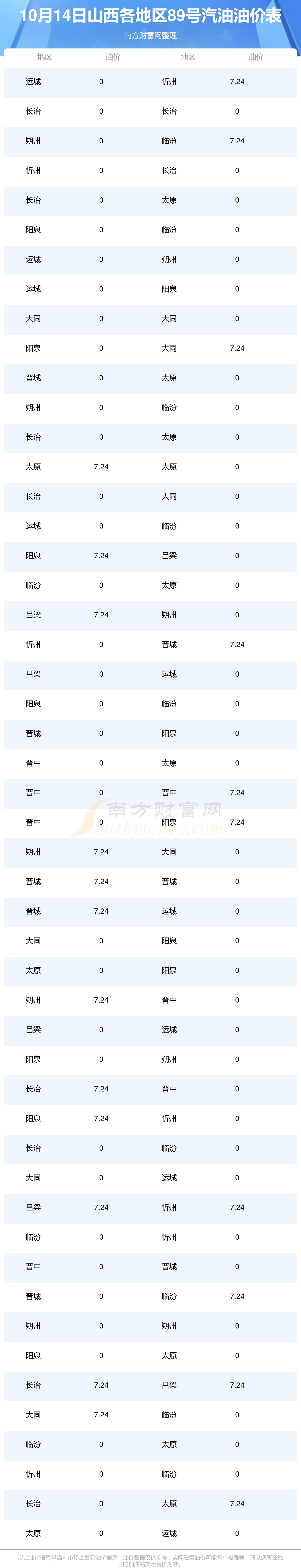 山西各地区最新89号汽油油价表
