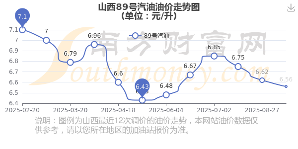 10月14日,山西89号汽油价格为6.56元每升,调整时间为10月14日,相对上次调整时间8月27日的油价6.62元/升,下调了0.06元。
