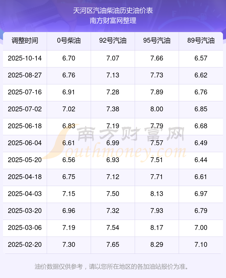 10月14日天河区汽油、柴油价格是多少钱一升?10月14日调整后,92号汽油为7.07元,降了0.06元,降幅达0.84%;95号汽油为7.66元,降了0.07元,降幅达0.91%;89号汽油为6.57元,降了0.05元,降幅达0.76%;0号柴油为6.7元,降了0.06元,降幅达0.89%。