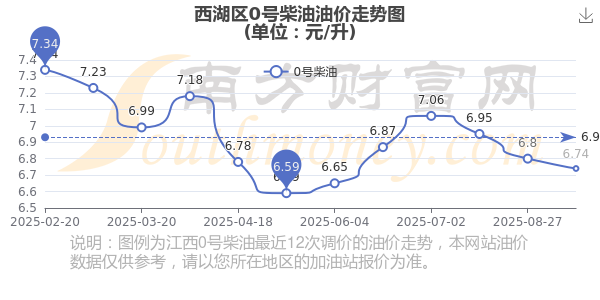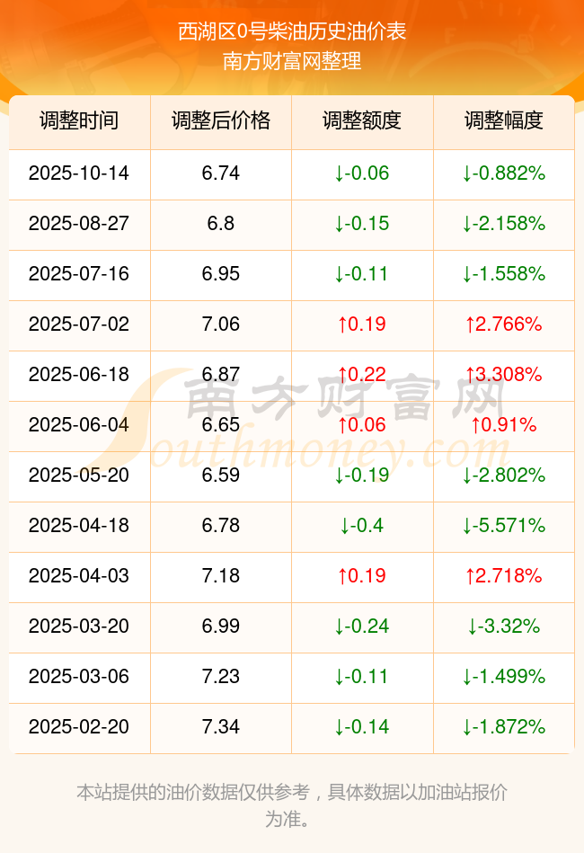 10月14日西湖区0号柴油的价格是6.74元/升(调整时间为10月14日),对比上次调整时间8月27日的油价6.8元/升,下调了0.06元,下调幅达0.882%。