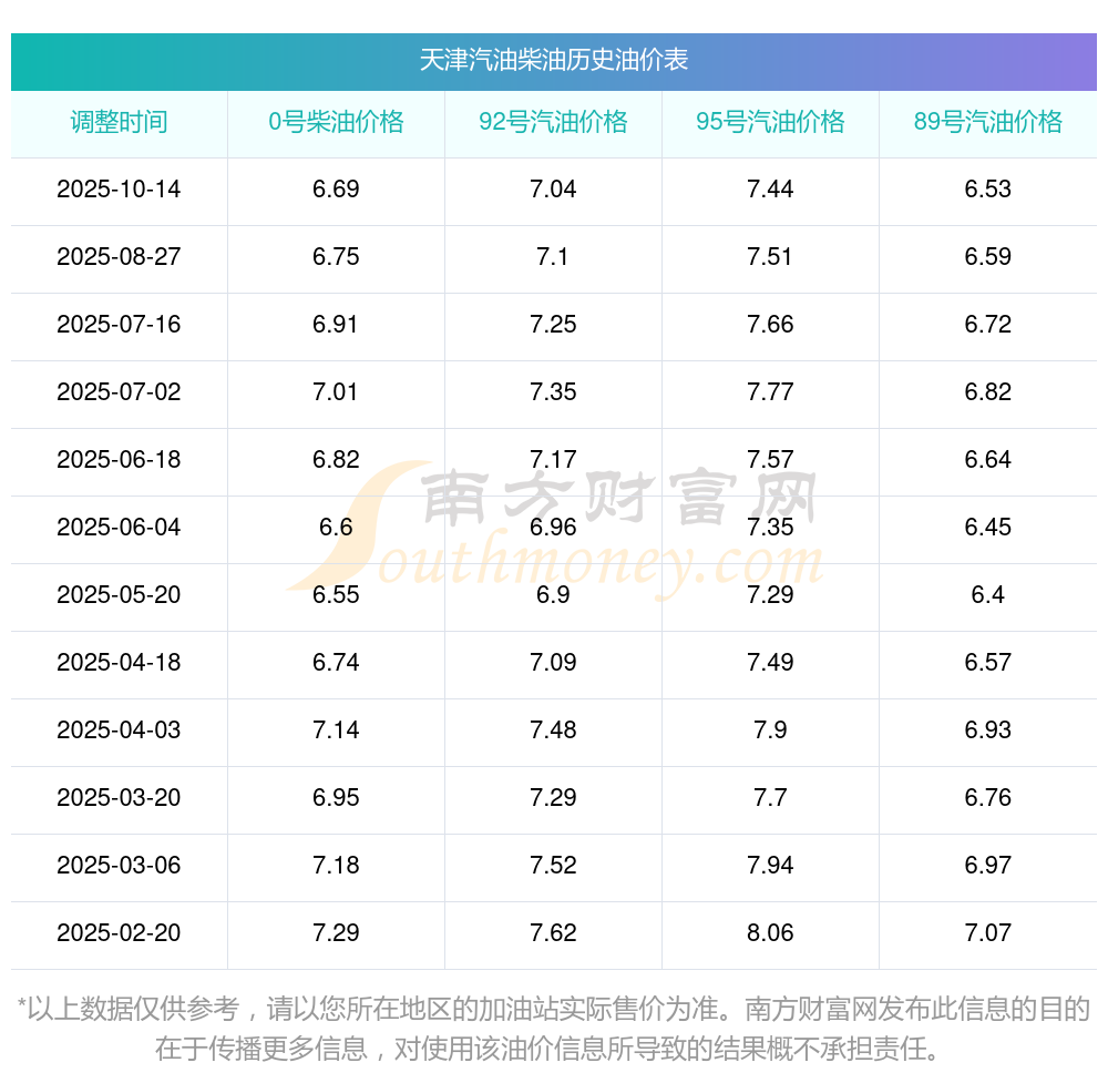 天津汽油、柴油10月15日每升最新价格查询:本轮油价调整时间为10月14日,92号汽油7.04元,跌了0.06元;95号汽油7.44元,跌了0.07元;89号汽油6.53元,跌了0.06;0号柴油6.69元,跌了0.06元。