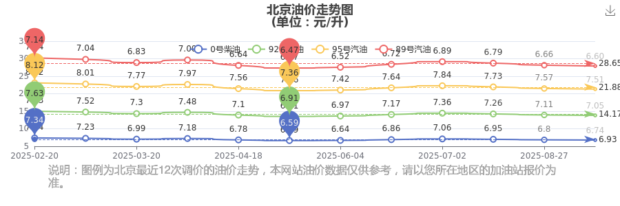 10月15日北京汽油、柴油每升的价格具体为:本轮油价调整时间为10月14日,92号汽油是7.05元,跌了0.06元,跌幅达0.84%;95号汽油是7.51元,跌了0.06元,跌幅达0.79%;89号汽油为6.6元,跌了0.06元,跌幅达0.9%;0号柴油为6.74元,跌了0.06元,跌幅达0.88%。