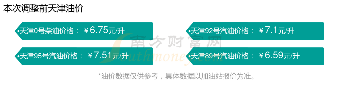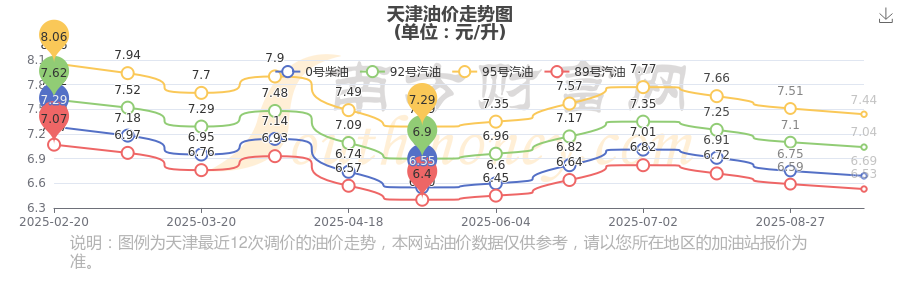 10月15日天津汽油柴油每升的价格为10月14日调整后的价格,具体如下:92号汽油7.04元;95号汽油7.44元;89号汽油6.53元;0号柴油6.69元。