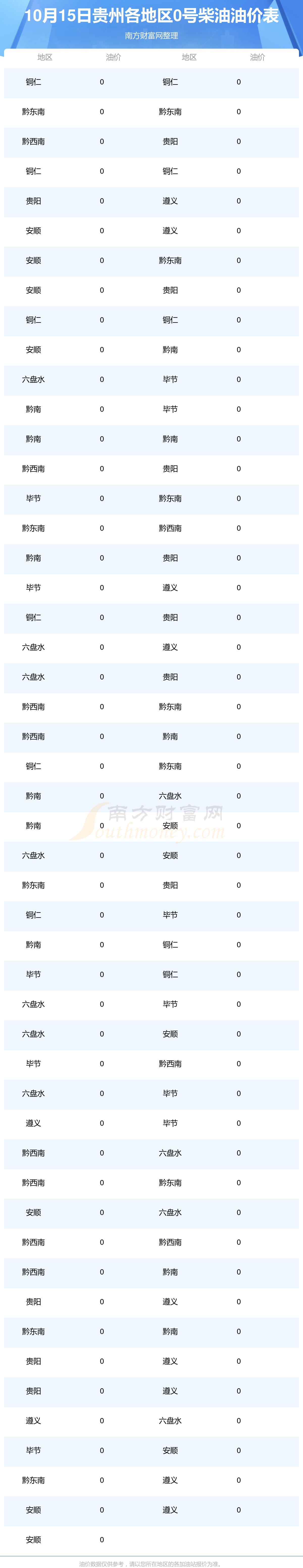 贵州各地区最新0号柴油油价表