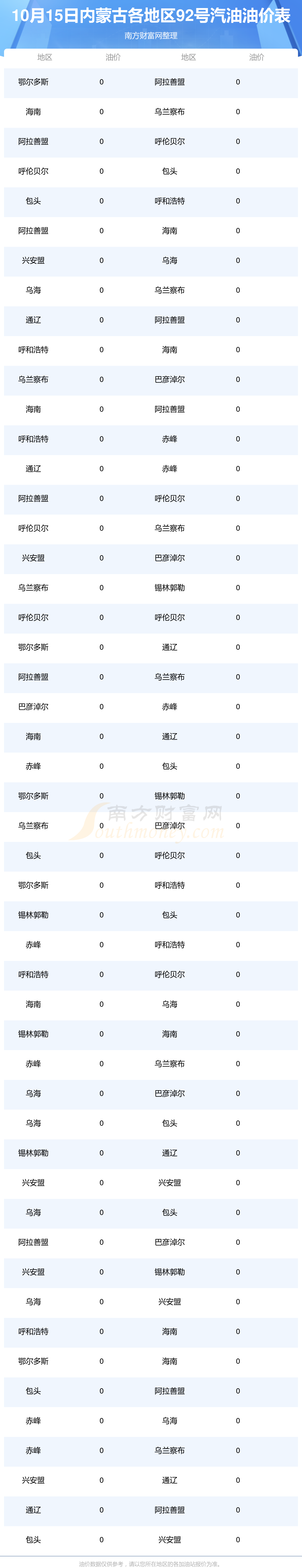 内蒙古各地区最新92号汽油油价表