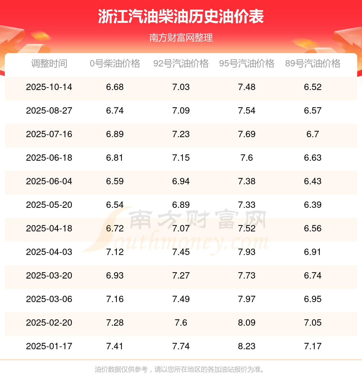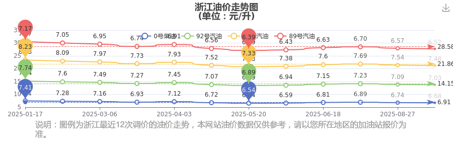10月15日浙江汽油、柴油每升的价格具体为:本轮油价调整时间为10月14日,92号汽油是7.03元,降了0.06元,降幅达0.85%;95号汽油是7.48元,降了0.06元,降幅达0.8%;89号汽油为6.52元,降了0.05元,降幅达0.76%;0号柴油为6.68元,降了0.06元,降幅达0.89%。
