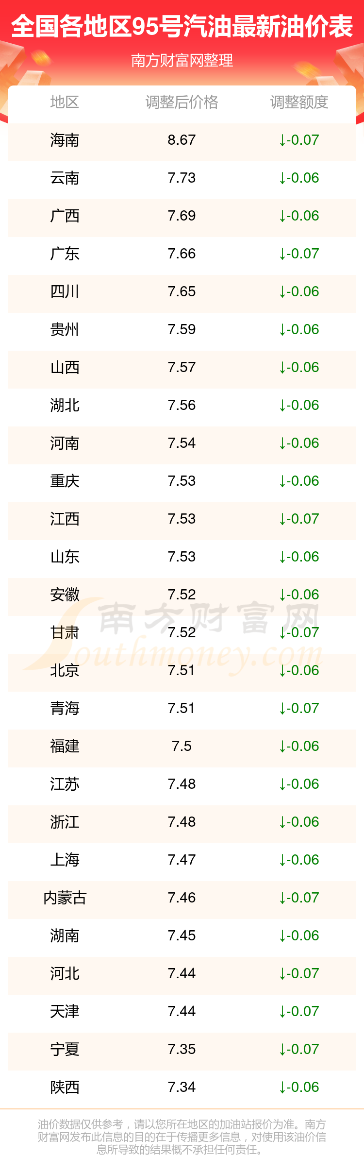 全国95号汽油10月15日的最新价格是10月14日油价调整后的价格,详情如下:平均价格为8元/升,最低的是陕西,价格7.34元/升,最高的是海南,价格8.67元/升。