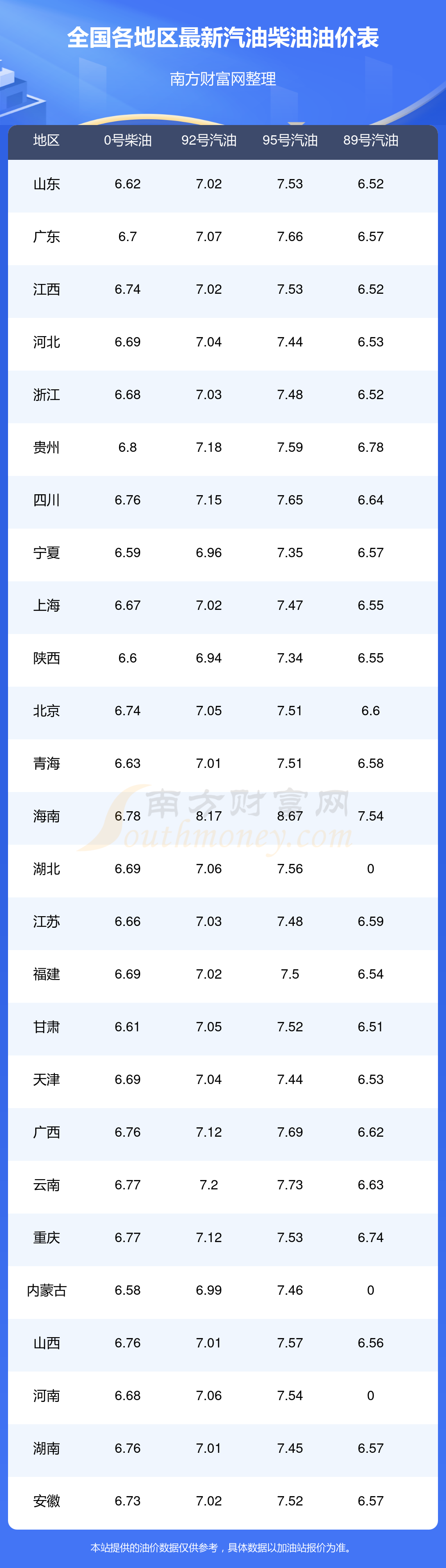 以上数据仅供参考,请以您所在地区的加油站实际售价为准。油价发布此信息的目的在于传播更多信息,对使用该油价信息所导致的结果概不承担责任。