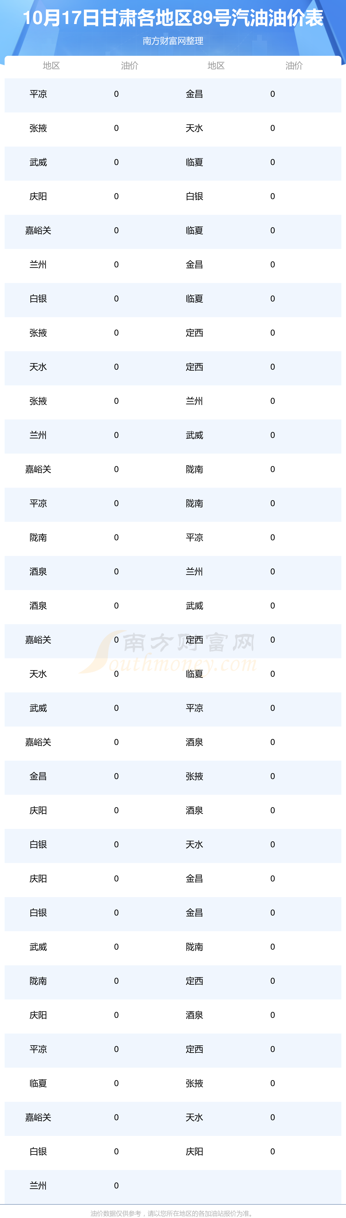10月17日甘肃89号汽油的价格是6.51元/升,本次油价调整时间是10月14日,上次调整时间是7月16日,调整后油价6.57元/升,本次对比减了0.06元,减幅为0.913%。