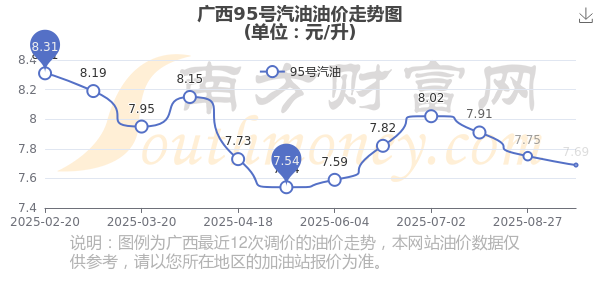 10月17日,广西95号汽油的价格是7.69元每升,本次的调整时间为10月14日,对比上次的调整降了0.06元,降0.774%,10月27日24时为下一轮油价调整时间,还有10.96天。