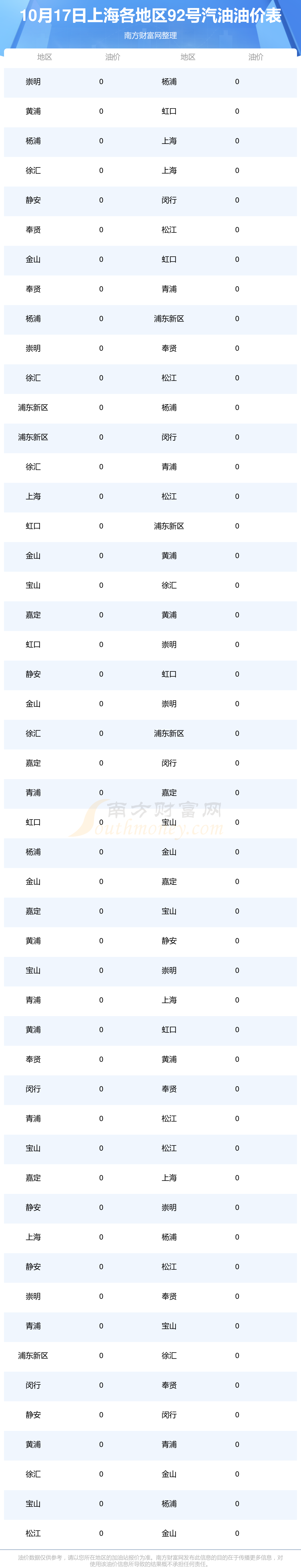 10月17日,上海92号汽油最新价格为:7.02元每升,调整时间为10月14日,相对上次调整时间8月27日的油价7.08元每升,下跌了0.06元,下跌幅达0.847%。