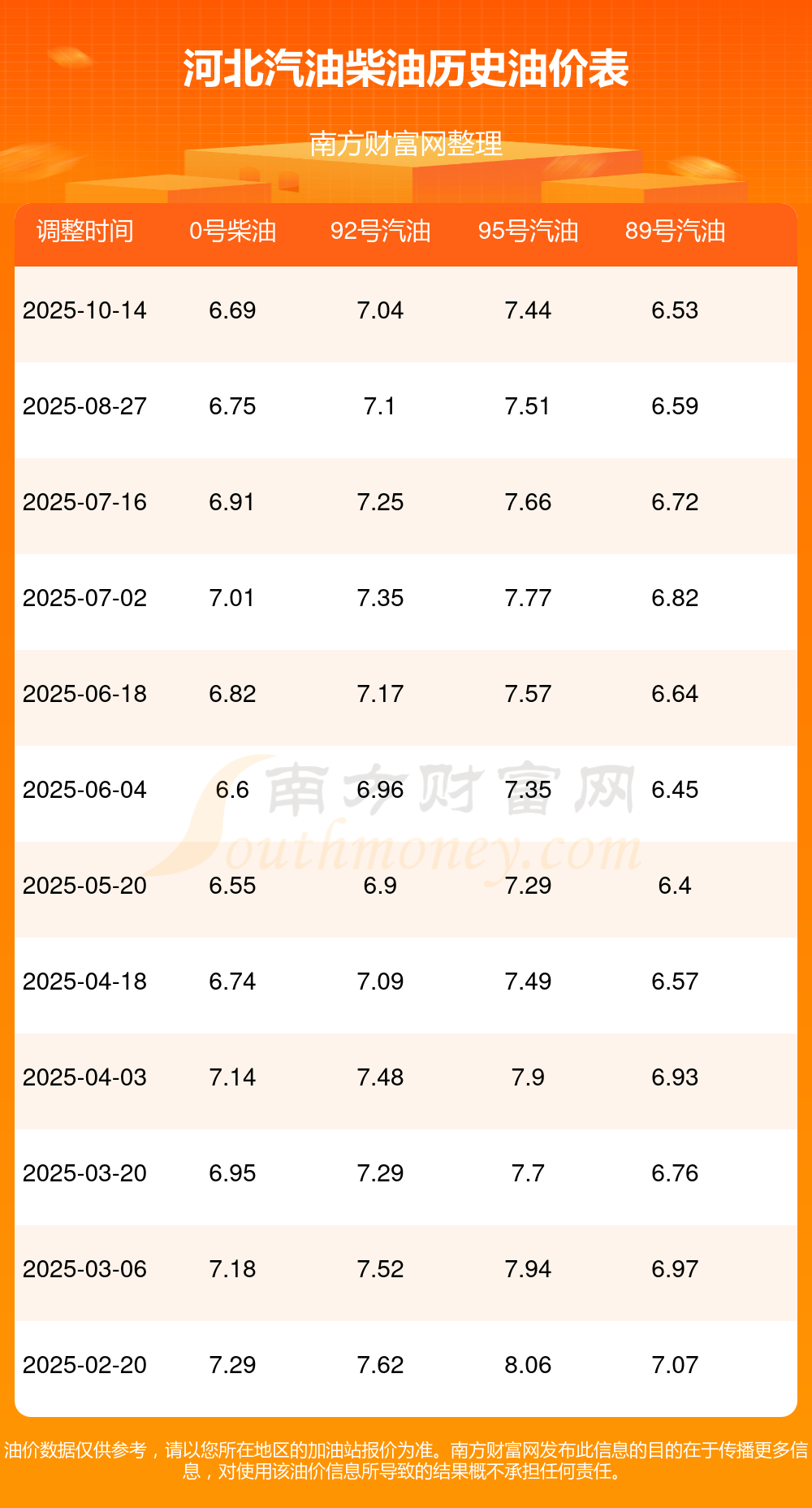 10月17日河北汽油、柴油每升的价格为10月14日调整后的价格,92号汽油为7.04元,跌了0.06元,跌幅达0.85%;95号汽油为7.44元,跌了0.07元,跌幅达0.93%;89号汽油为6.53元,跌了0.06元,跌幅达0.91%;0号柴油为6.69元,跌了0.06元,跌幅达0.89%。
