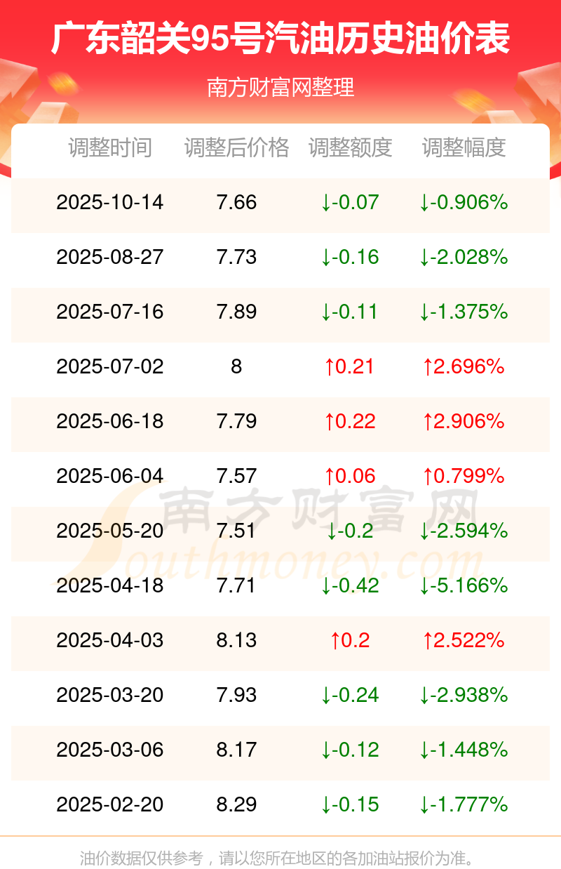 广东韶关95号汽油10月17日的价格为7.66元/升,本次油价的调整时间为10月14日,对比上次油价调整时间8月27日的价格7.73元/升,共减了0.07元,减幅达0.906%。