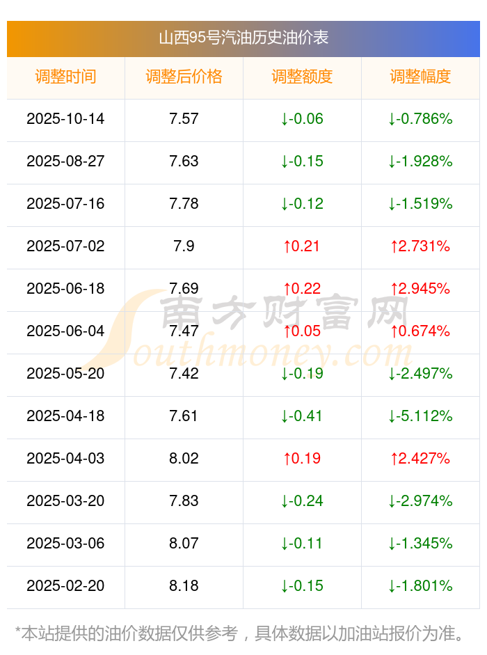 10月18日,山西95号汽油油价是7.57元每升,本次油价格调整时间为10月14日,上次调整时间为8月27日,山西95号汽油7.63元每升,本次对比下降了0.06元。