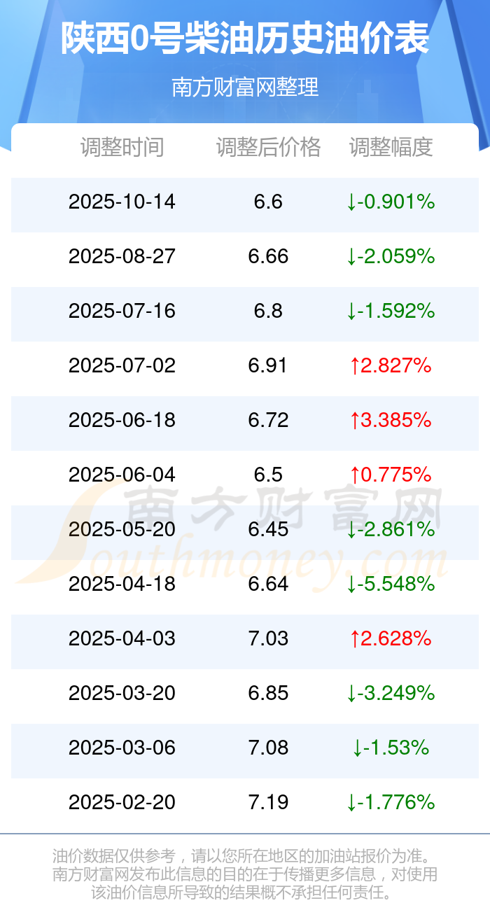 10月18日陕西0号柴油的价格是6.6元/升,本次油价调整时间是10月14日,上次调整时间是8月27日,调整后油价6.66元/升,本次对比下调了0.06元,下调幅为0.901%。