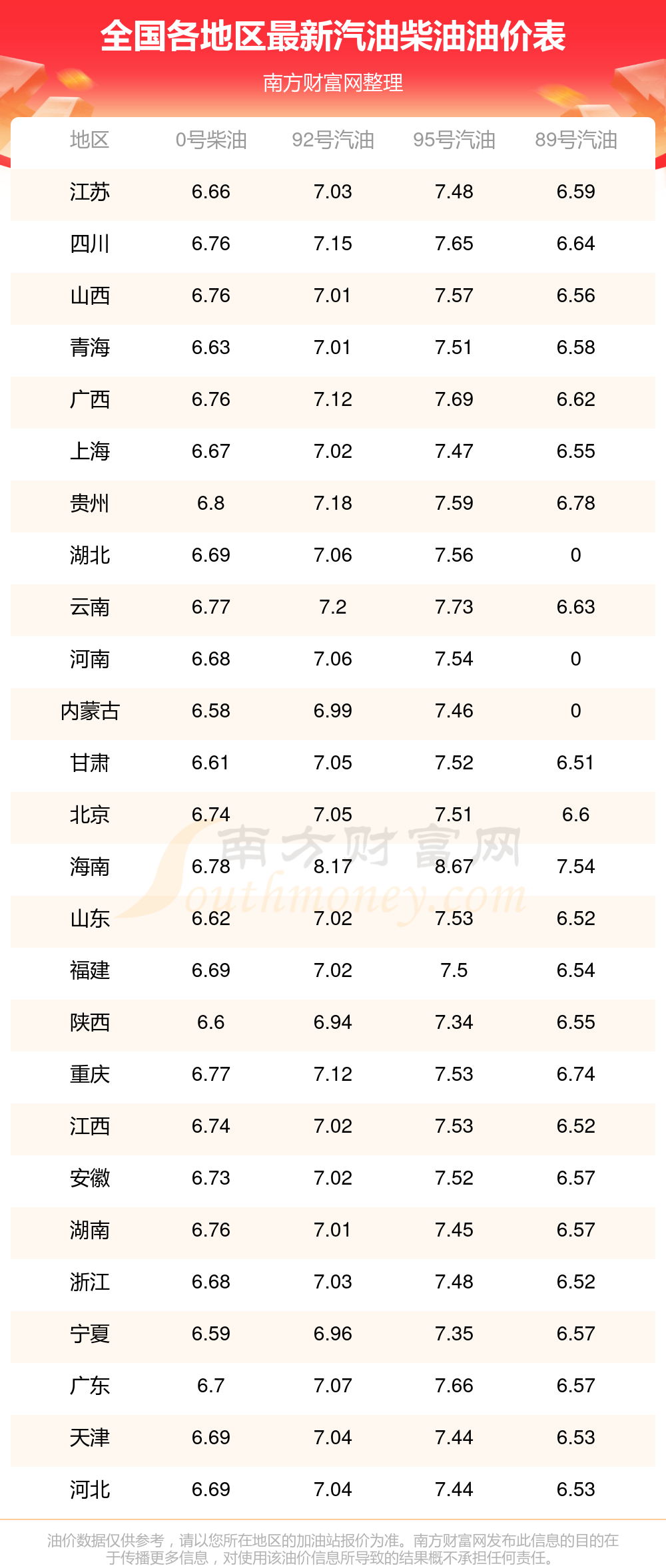 以上油价信息是当前市场上最新油价信息,油价数据仅供参考,实际在售油价可能有小幅偏差,请以您所在地区的加油站实际售价为准。