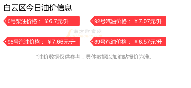 10月18日白云区汽油、柴油每升价格详情为:92号汽油为7.07元,下调了0.06元;95号汽油为7.66元,下调了0.07元;89号汽油为6.57元,下调了0.05元;0号柴油为6.7元,下调了0.06元,本次油价调整时间为10月14日。