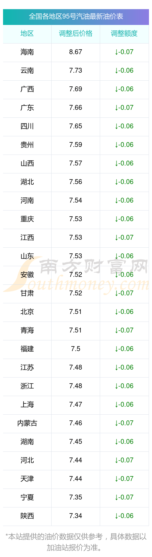 以上数据仅供参考,请以您所在地区的加油站实际售价为准。油价发布此信息的目的在于传播更多信息,对使用该油价信息所导致的结果概不承担责任。