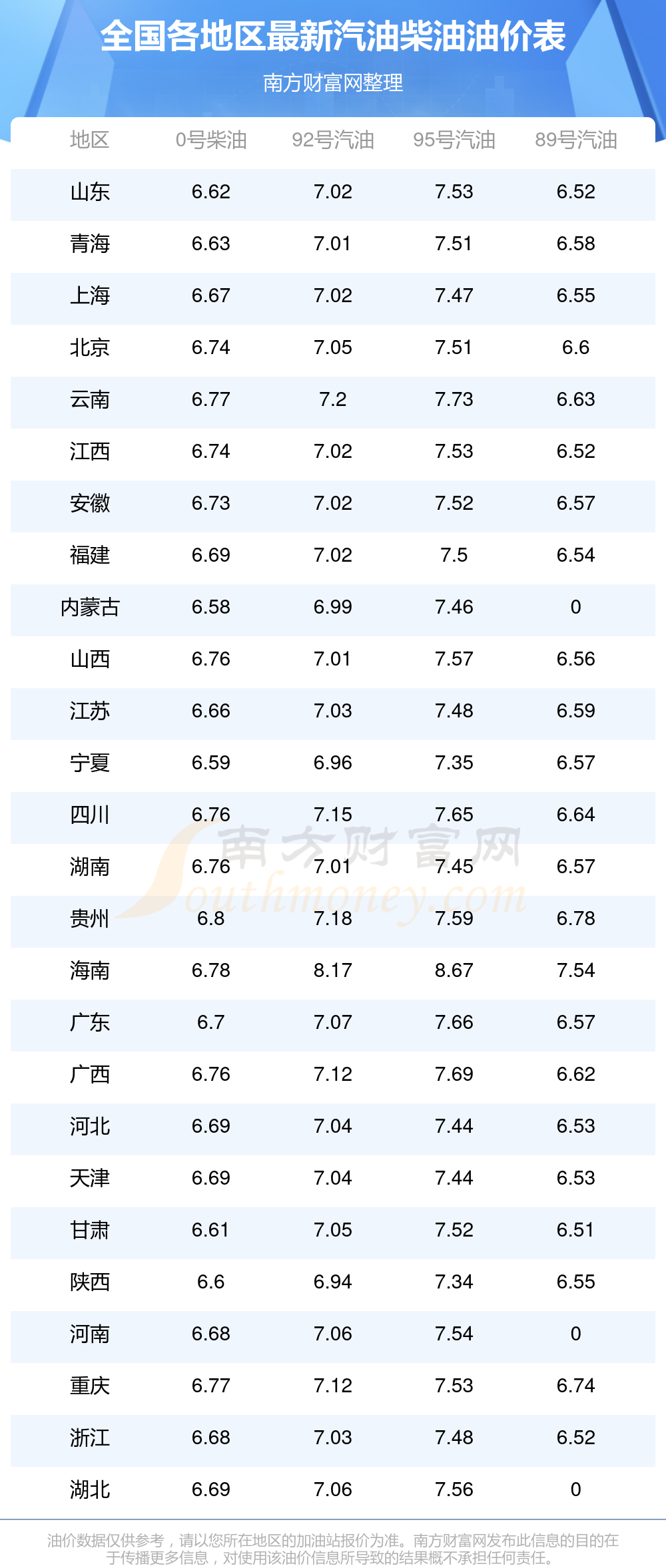 以上数据仅供参考,请以您所在地区的加油站实际售价为准。油价发布此信息的目的在于传播更多信息,对使用该油价信息所导致的结果概不承担责任。