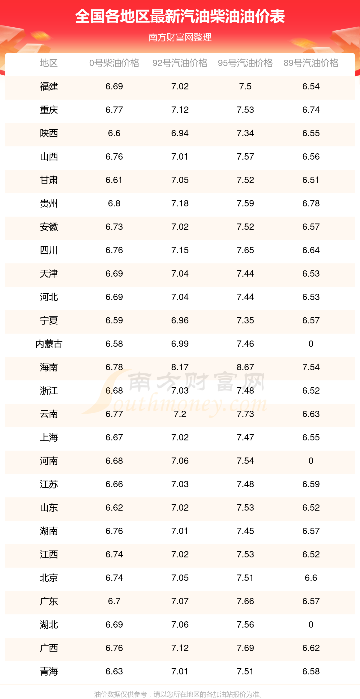 国内今日油价95号汽油-10月18日全国汽油价格95号汽油一览表