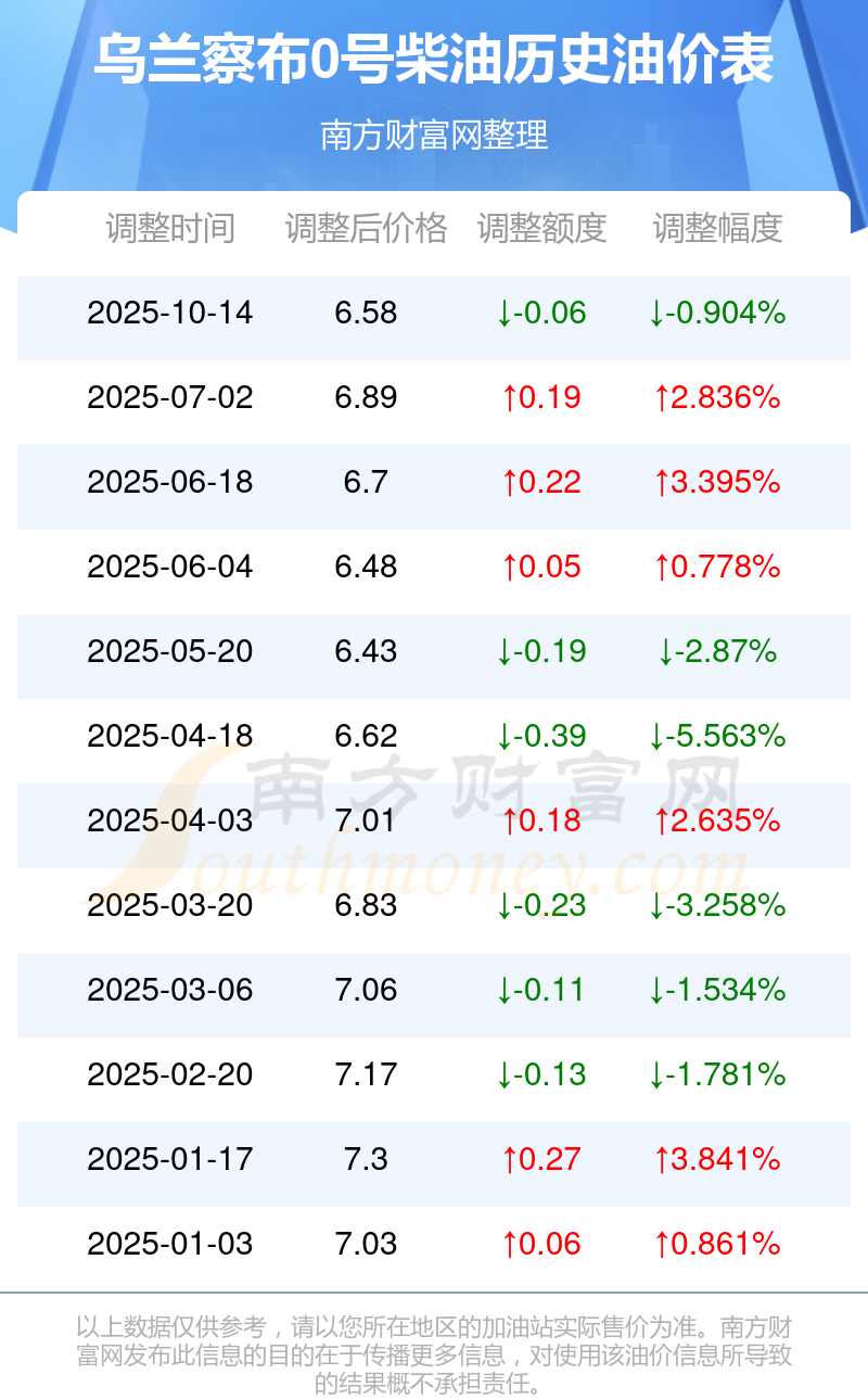 乌兰察布0号柴油历史油价表