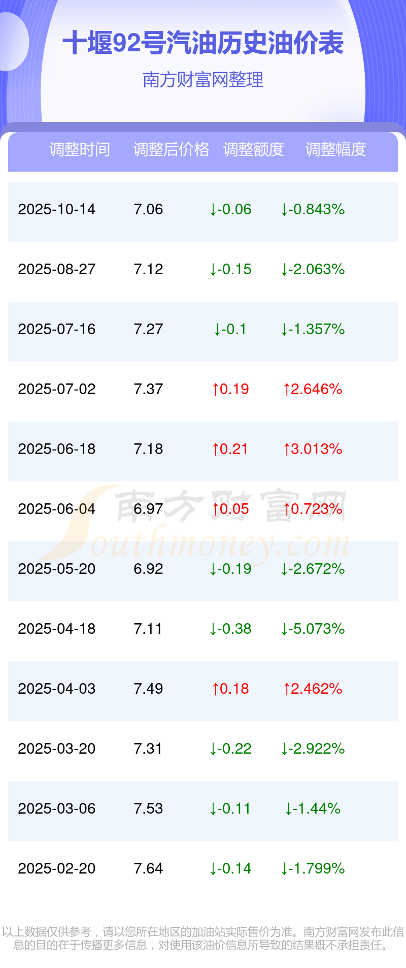 以上数据仅供参考,请以您所在地区的加油站实际售价为准。油价发布此信息的目的在于传播更多信息,对使用该油价信息所导致的结果概不承担责任。