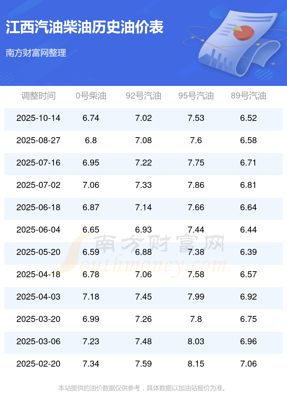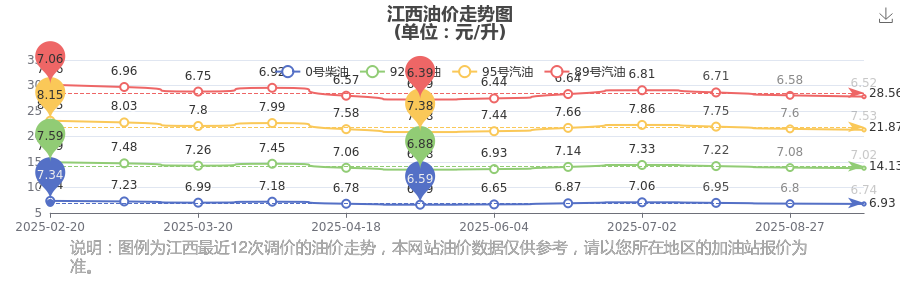 10月18日,江西汽油、柴油每升的价格为:92号汽油7.02元,下降了0.06元;95号汽油7.53元,下降了0.07元;89号汽油6.52元,下降了0.06;0号柴油为6.74元,下降了0.06元,本轮调整时间是10月14日。