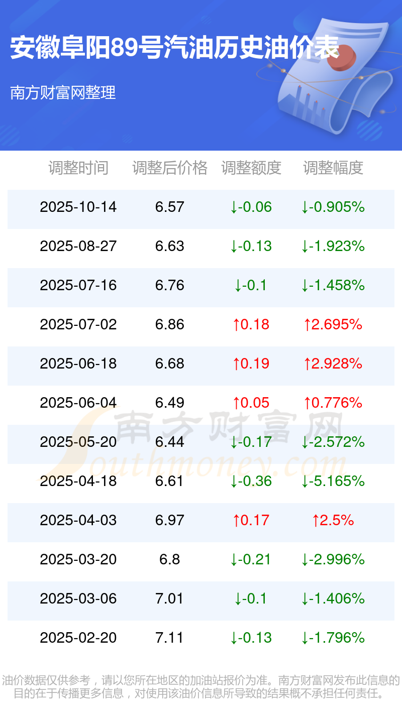 安徽阜阳89号汽油历史油价表