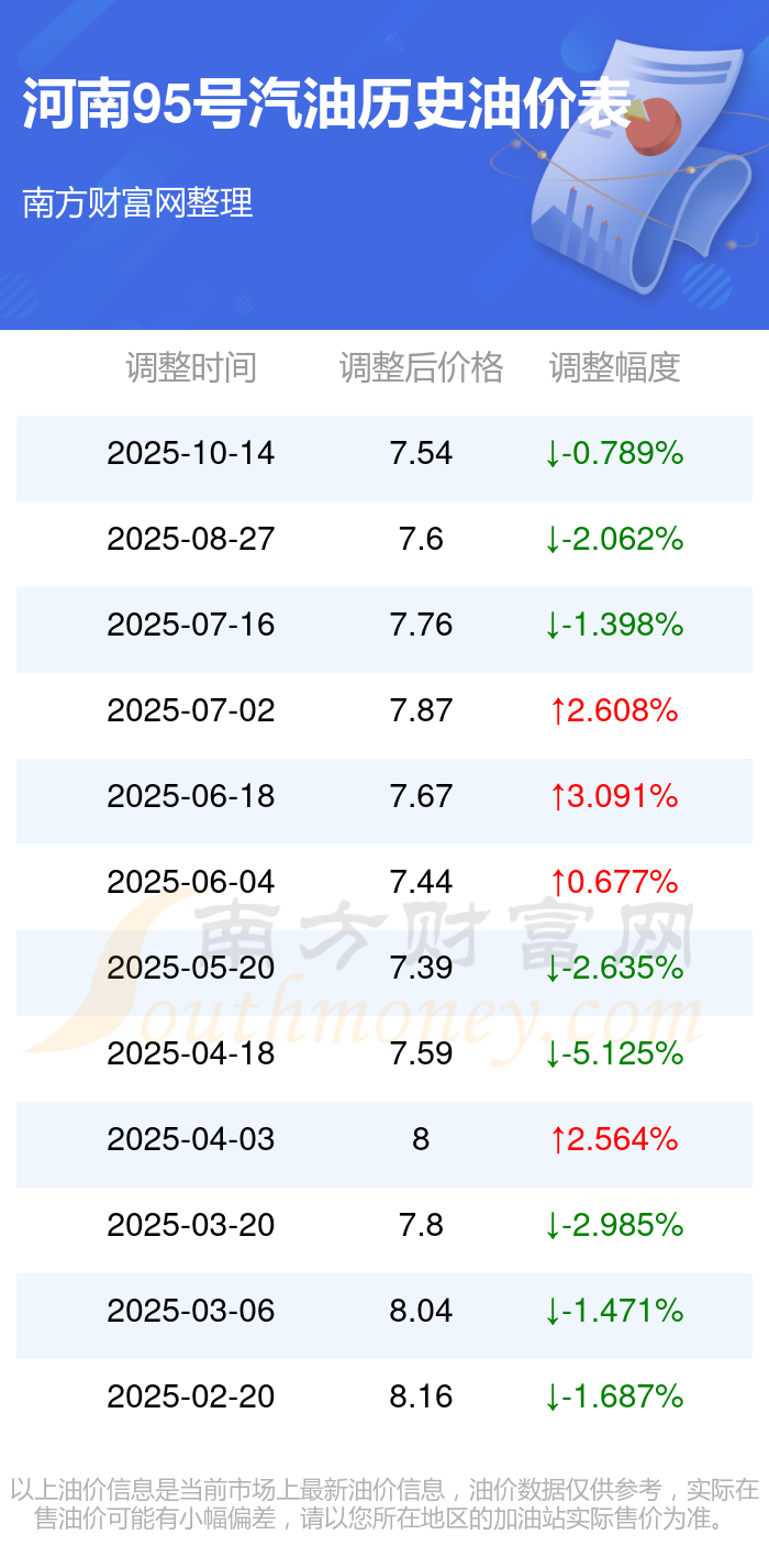 10月18日,河南95号汽油最新价格为:7.54元每升,调整时间为10月14日,相对上次调整时间8月27日的油价7.6元每升,下调了0.06元,下调幅达0.789%。