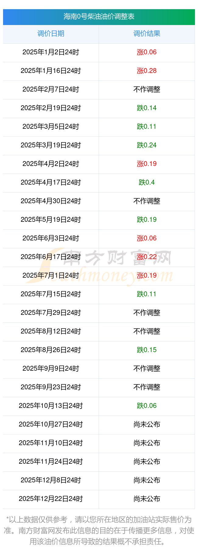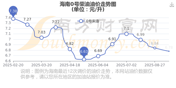 10月18日,海南0号柴油的价格是6.78元每升,本次的调整时间为10月14日,对比上次的调整降了0.06元,降0.877%,10月27日24时为下一轮油价调整时间,还有9.95天。