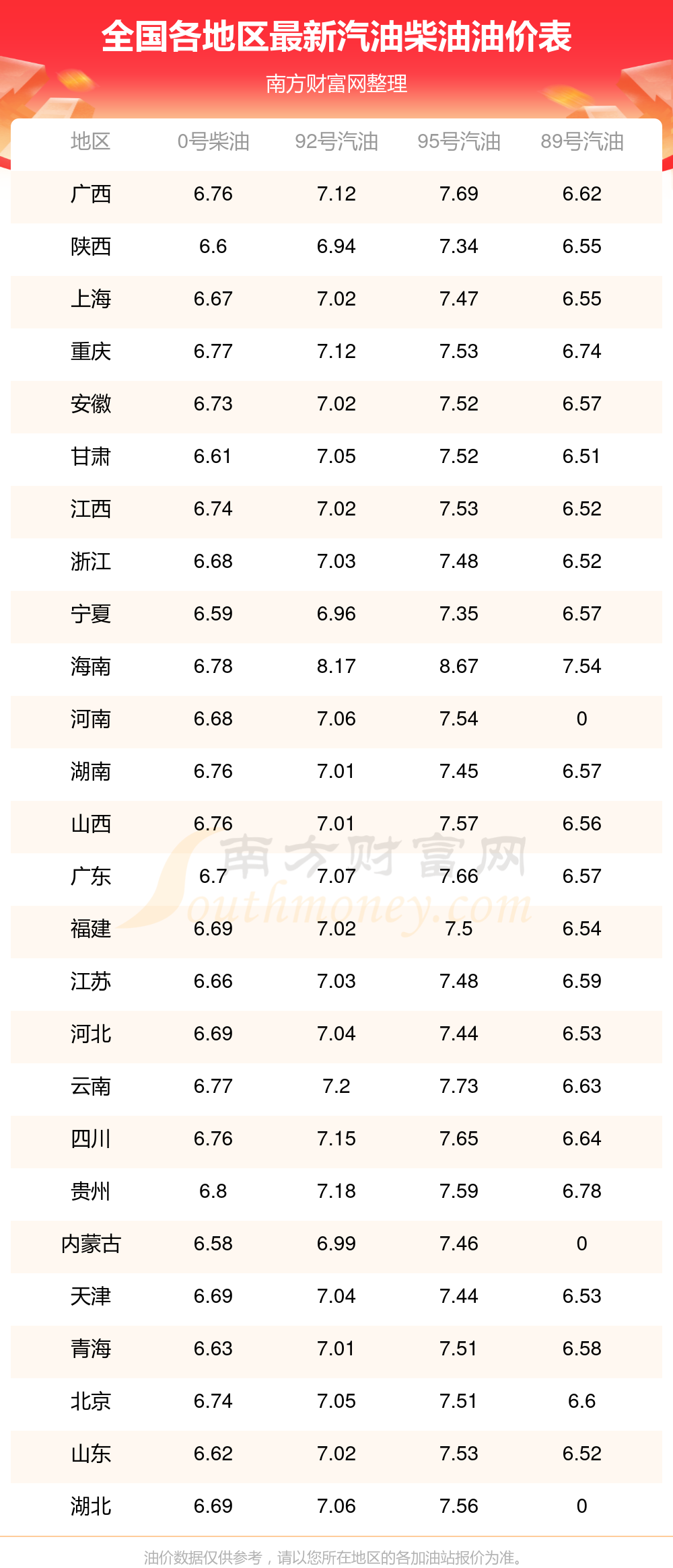 全国各地区最新汽油价格表