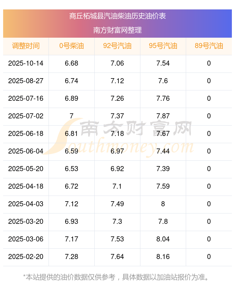 以上油价信息是当前市场上最新油价信息,油价数据仅供参考,实际在售油价可能有小幅偏差,请以您所在地区的加油站实际售价为准。