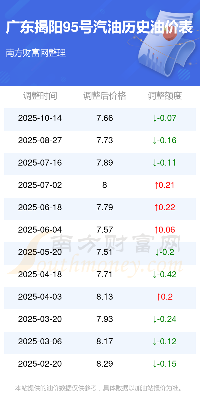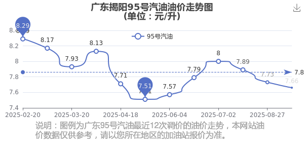 10月18日广东揭阳95号汽油的最新价格:广东揭阳95号汽油7.66元/升(根据10月14日调整后的价格),相对上次调整时间8月27日的油价7.73元每升,下跌了0.07元,下跌0.906%。