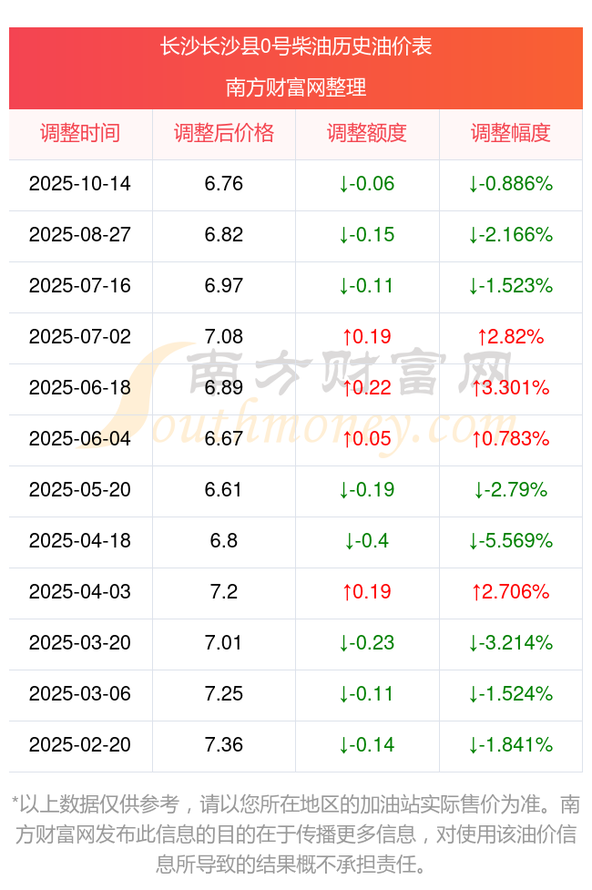 今日长沙长沙县0号柴油油价表一览(10月18日)