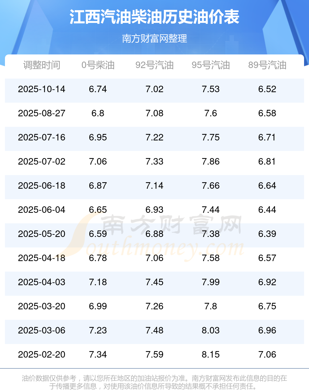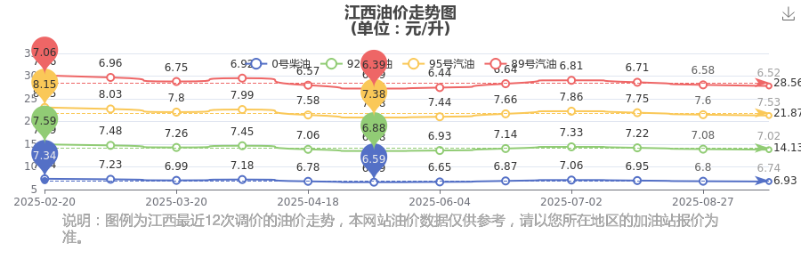 10月18日江西汽油、柴油每升的最新价格:92号汽油7.02元,下调了0.06元;95号汽油7.53元,下调了0.07元;89号汽油6.52元,下调了0.06;0号柴油为6.74元,下调了0.06元,本次油价调整时间是10月14日。