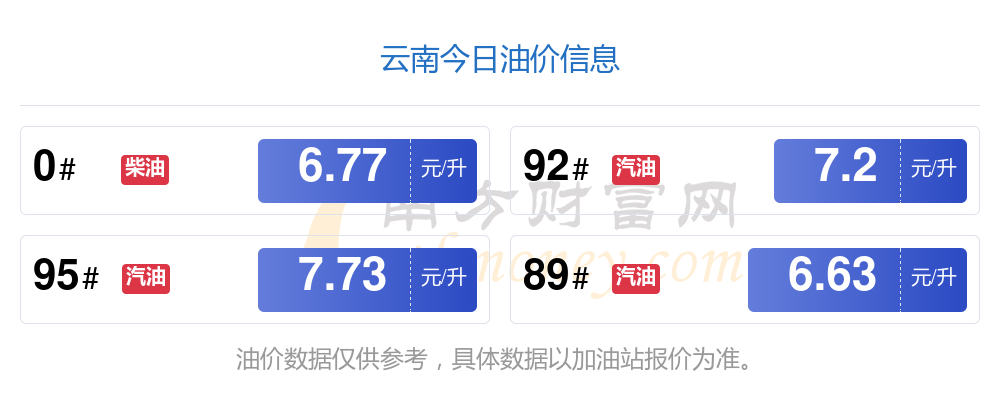 10月18日,云南汽油、柴油每升最新价格为:92号汽油为7.2元,下降了0.06元;95号汽油为7.73元,下降了0.06元;89号汽油为6.63元,下降了0.06;0号柴油为6.77元,下降了0.06元,调整时间为10月14日。