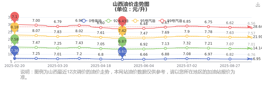 10月18日,山西汽油、柴油每升最新价格为:调整时间为10月14日,92号汽油为7.01元,减了0.06元,减幅达0.85%;95号汽油为7.57元,减了0.06元,减幅达0.79%;89号汽油为6.56元,减了0.06元,减幅达0.91%;0号柴油为6.76元,减了0.06元,减幅达0.88%。