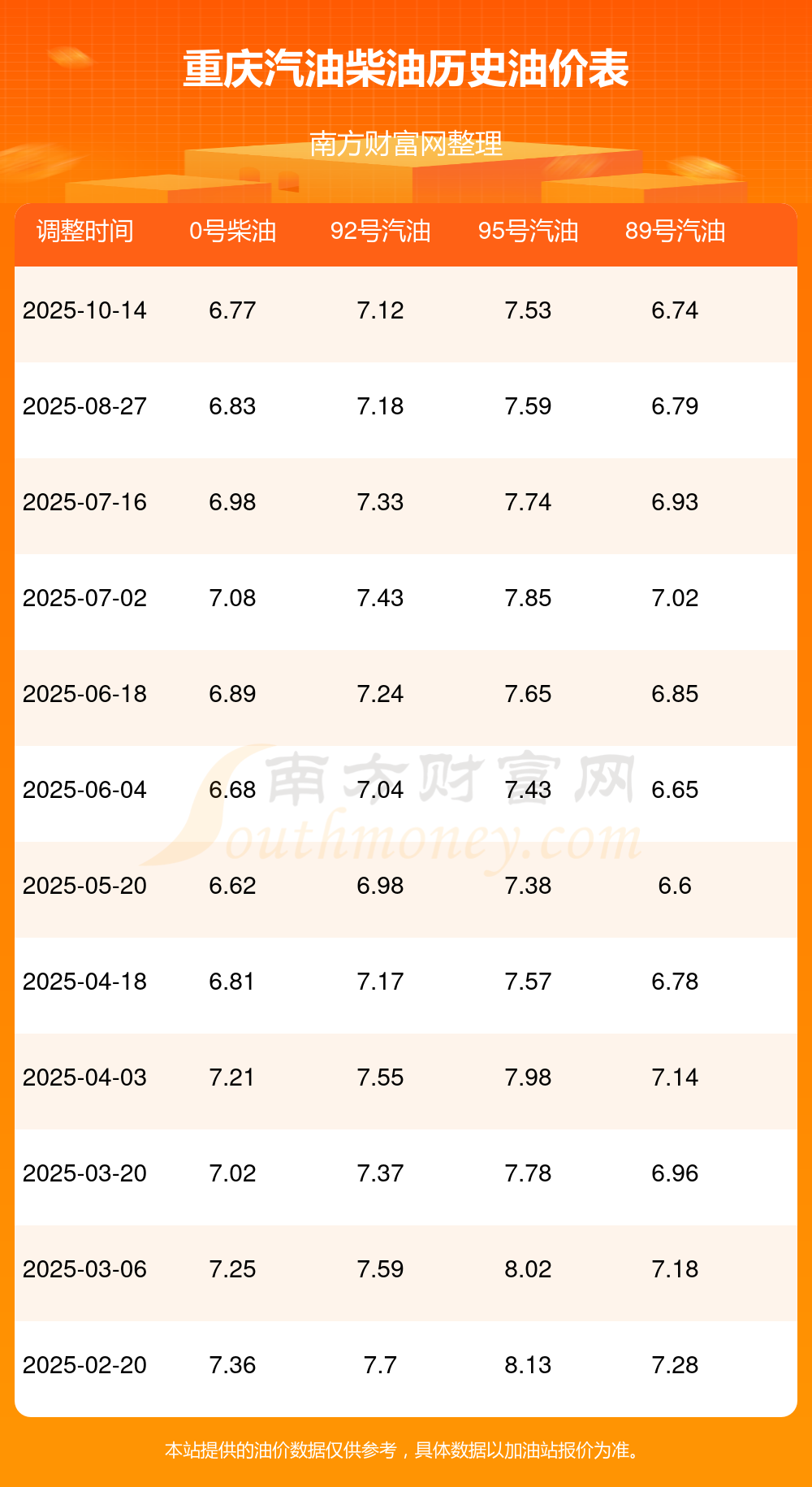 10月19日重庆汽油、柴油最新价格:本次油价调整时间是10月14日,92号汽油7.12元,减了0.06元,减幅达0.84%;95号汽油7.53元,减了0.06元,减幅达0.79%;89号汽油6.74元,减了0.05元,减幅达0.74%;0号柴油6.77元,减了0.06元,减幅达0.88%。