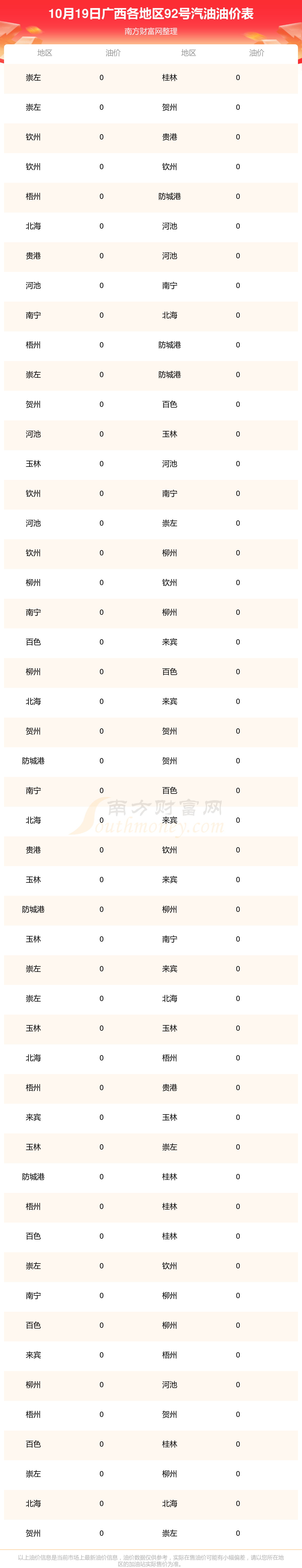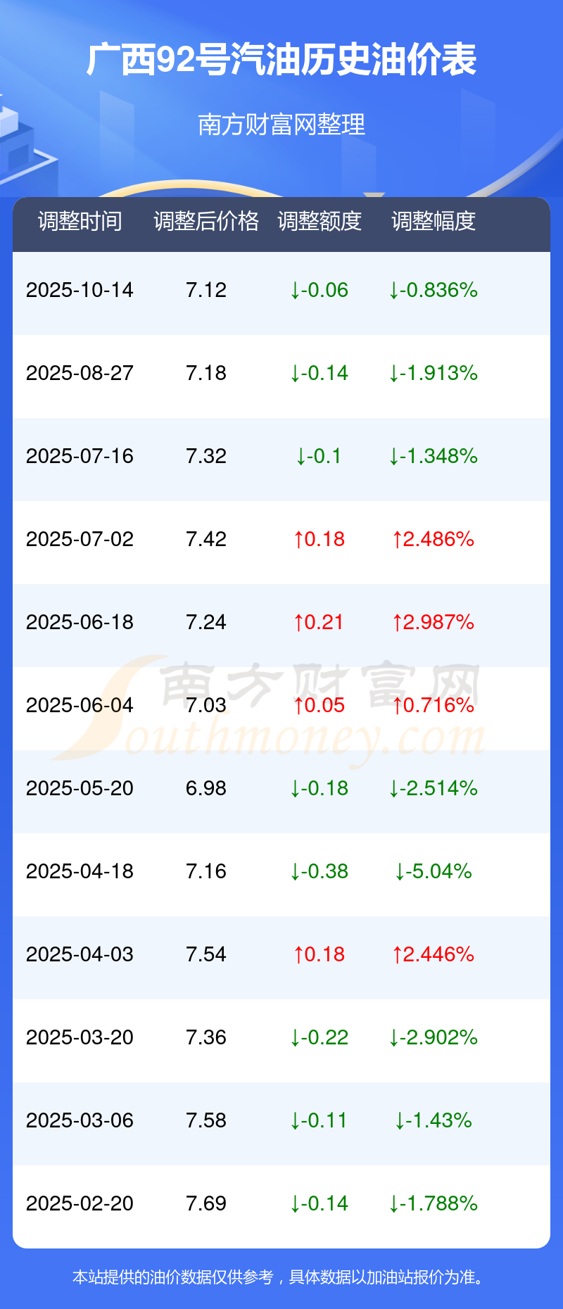 广西92号汽油10月19日价格为7.12元/升,调整时间为10月14日,对比上次调整下降了0.06元。