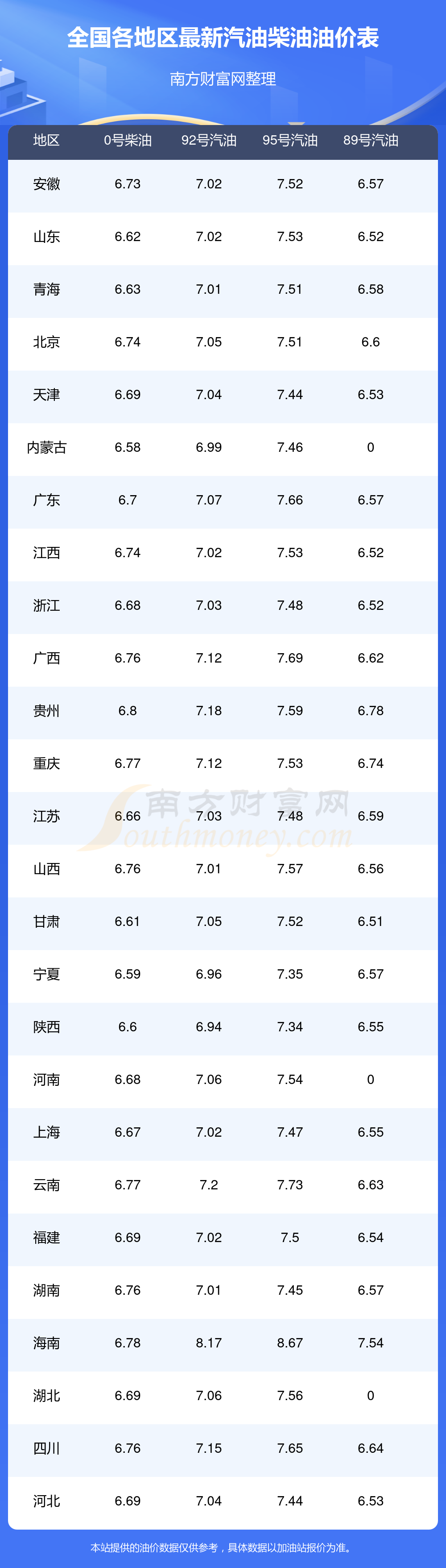 全国各地区最新油价表