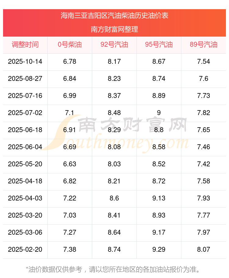 海南三亚吉阳区今日油价_92号95号汽油价格一览表(10月19日)