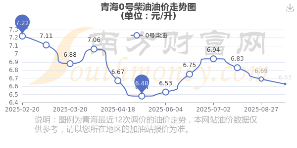 10月19日,青海0号柴油的价格是6.63元每升,本次的调整时间为10月14日,对比上次的调整下调了0.06元,下调0.897%,10月27日24时为下一轮油价调整时间,还有8.95天。