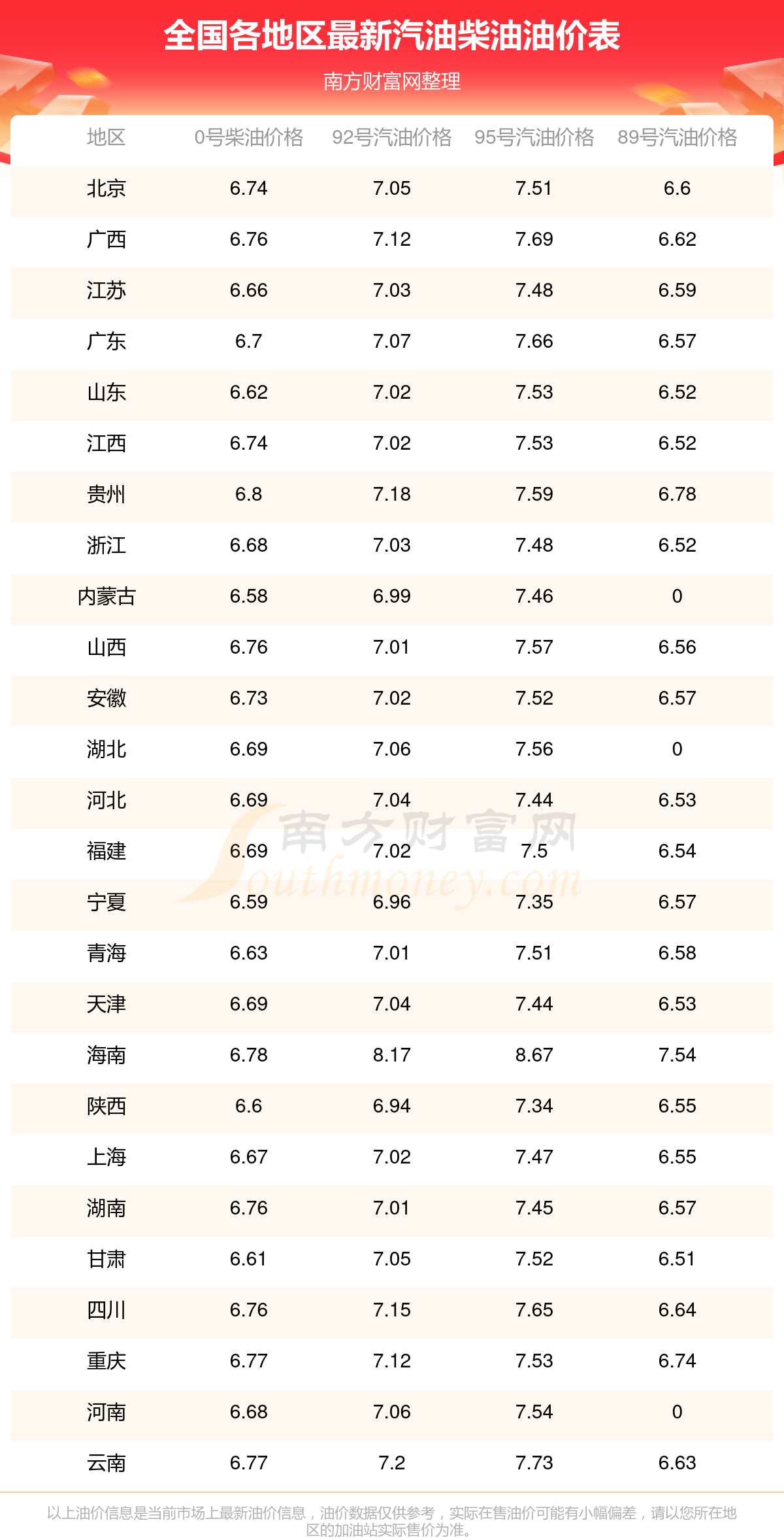 以上油价信息是当前市场上最新油价信息,油价数据仅供参考,实际在售油价可能有小幅偏差,请以您所在地区的加油站实际售价为准。