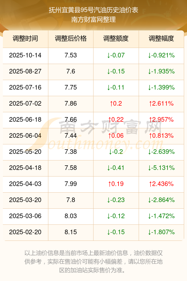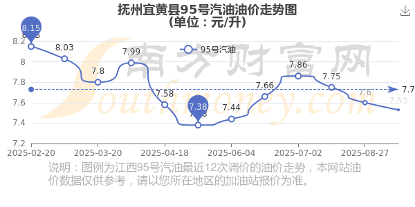 10月19日抚州宜黄县95号汽油的最新价格(10月14日调整后的价格):7.53元/升,相对上次调整跌了0.07元。