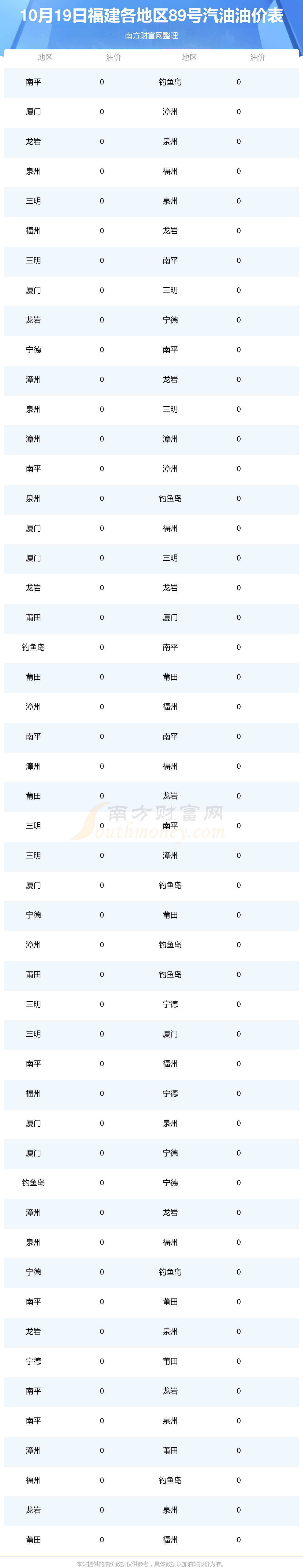 福建各地区最新89号汽油油价表