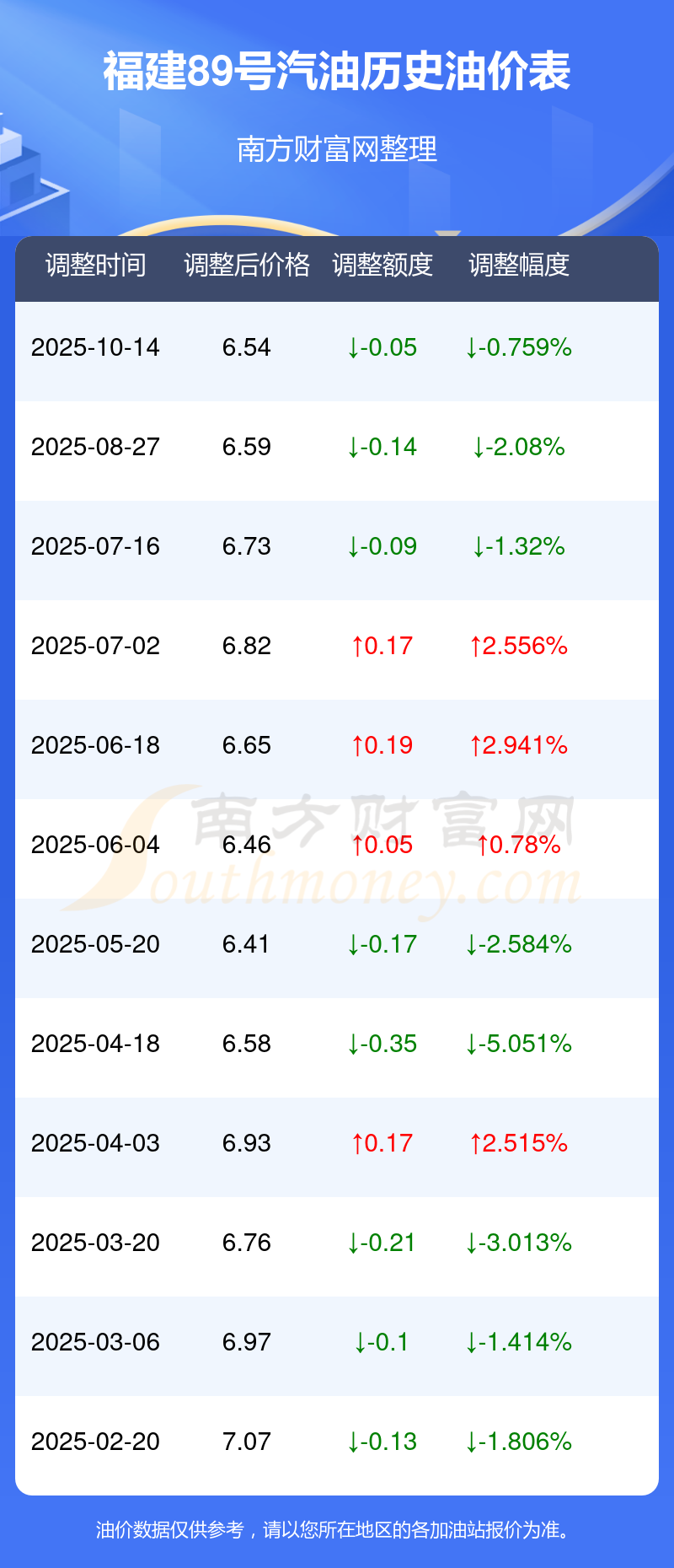 10月19日福建89号汽油最新价格是6.54元每升,调整时间为10月14日,相对上次调整下跌了0.05元,下跌0.759%。