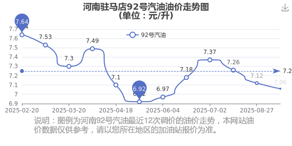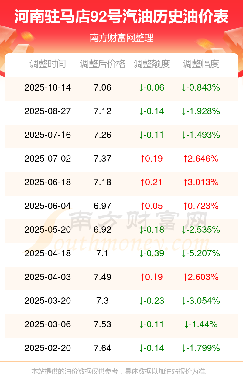 10月19日,河南驻马店92号汽油最新价格为7.06元/升,调整时间为10月14日,相对上次调整减了0.06元。