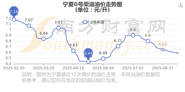 10月19日宁夏0号柴油的价格为6.59元/升,本轮调整时间是10月14日,相对比上一轮调整减了0.06元,减0.902%。