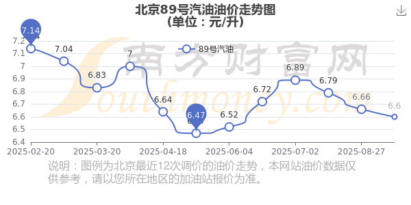 10月19日北京89号汽油价格是10月14日调整后的价格,为6.6元每升,相对上一轮调整时间8月27日的油价6.66元/升,跌了0.06元。