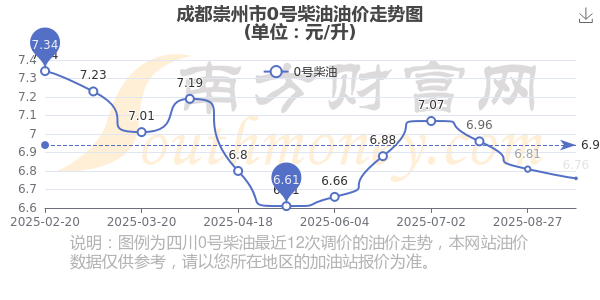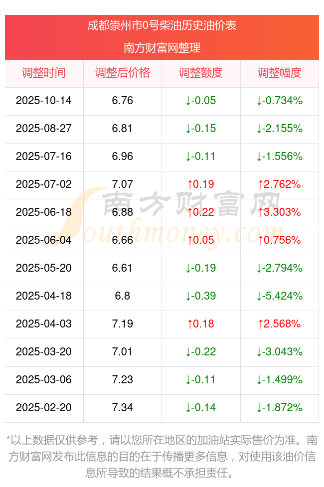 成都崇州市0号柴油10月19日的价格为每升6.76元,本次油价的调整时间10月14日,对比上次油价调整时间8月27日的价格6.81元/升,共跌了0.05元,跌幅达0.734%。